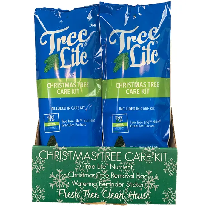 Tree Life™ Care Kits include: 1 White removal bag, 2 Granular packets of Tree Life Nutrient and 1 Static cling “Reminder” to water your Christmas tree.